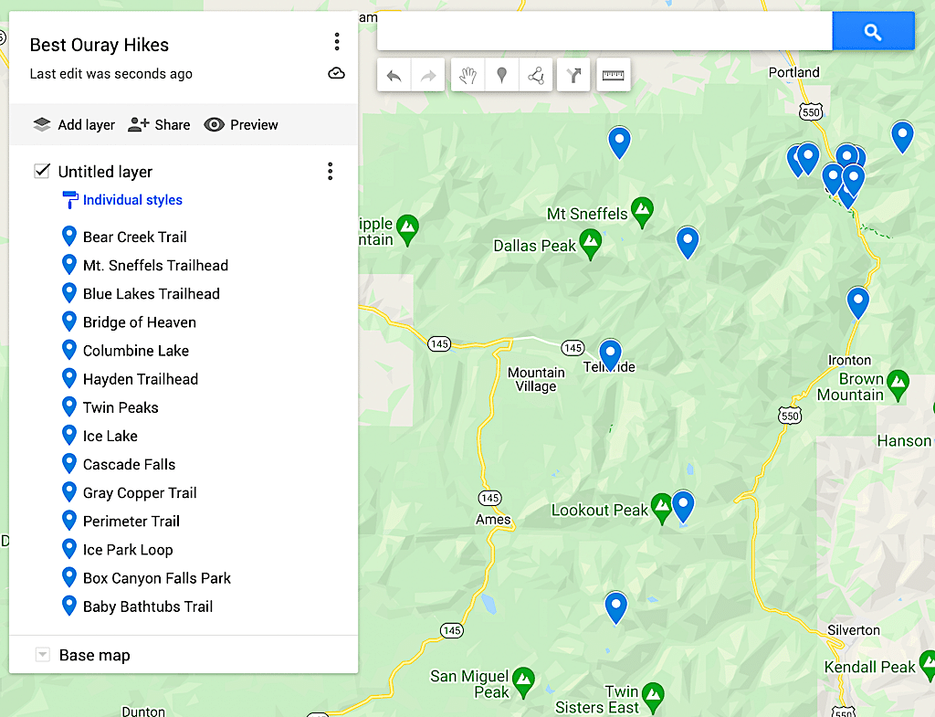 Below is a map of the best Ouray hikes to help you plan your trip. And for added convenience, please click here for the full map.